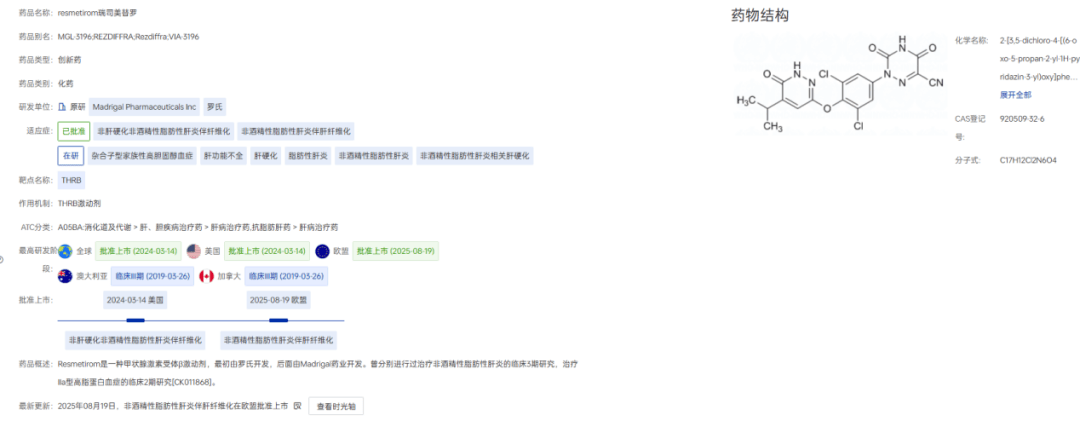 2024年3月,Madrigal Pharmaceuticals的Resmetirom(THR-β胀吹剂)获FDA照准,成为环球首款MASH药物,告竣了“从0到1”的冲破;2025年8月,诺和诺德的司美格鲁肽获批用于伴中度至重度肝纤维化(F2至F3期)的非肝硬化MASH成人患者,成为首个获批该顺应症的GLP-1疗法。